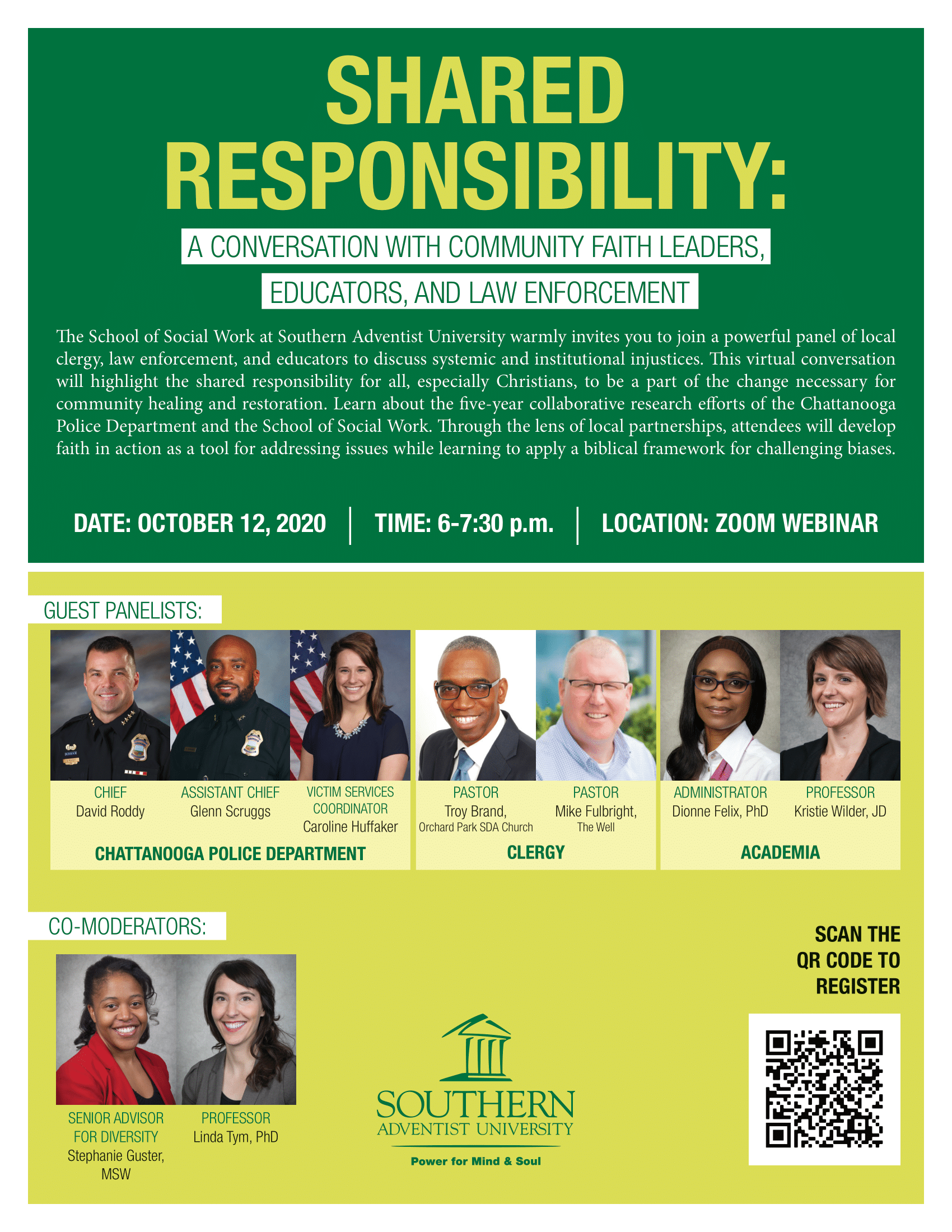 On October 12, 2020 a panel of local clergy, law enforcement, and educators from Southern came together to discuss systemic and institutional injustices. The virtual conversation highlighted the shared responsibility for all, especially Christians, to be a part of the change necessary for community healing and restoration. The conversation also emphasized the five-year collaborative research efforts of the Chattanooga Police Department and the School of Social Work. Through the lens of local partnerships, attendees developed faith in action as a tool for addressing issues while learning to apply a biblical framework for challenging biases. If you missed the opportunity to attend, the School of Social Work at Southern Adventist University warmly invites you to watch the recorded critical conversation on shared responsibility, by clicking here.